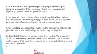 GC Gold Label 9 is a high-strength radiopaque glass ionomer restorative designed for posterior teeth, offering chemical adhesion without the need for etching or bonding agents. It features superior wear resistance, low solubility, and moisture sensitivity while facilitating internal remineralization through strontium-based fluoride. Its application involves a specific procedure including conditioning, contouring, and protective coating to ensure optimal restoration outcomes.