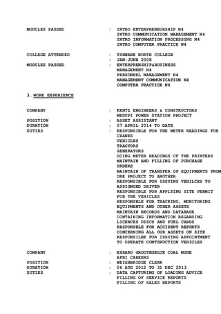This curriculum vitae is for Glender Chweng Kgare, with personal details including date of birth, ID number, and contact information. It outlines his educational qualifications including completing grade 12 in 2001 and various further education qualifications in entrepreneurship, management, and project management between 2007-2016. Work experience is detailed from 2012-present in roles such as asset assistant, weighbridge clerk, and laboratory assistant. Skills include office support, customer service, data capturing, and problem solving. References are provided from previous employers.