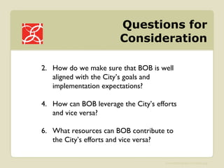 Building Opportunities with Business (BOB) is a non-profit in Vancouver focused on inclusive inner-city revitalization that enhances community capacity and creates economic opportunities. It emphasizes collaboration with the city and local organizations to align goals, drive green initiatives, and support sustainable business growth without displacing existing residents. Key achievements include significant grants and loans to local businesses and initiatives aimed at developing a local green economy.