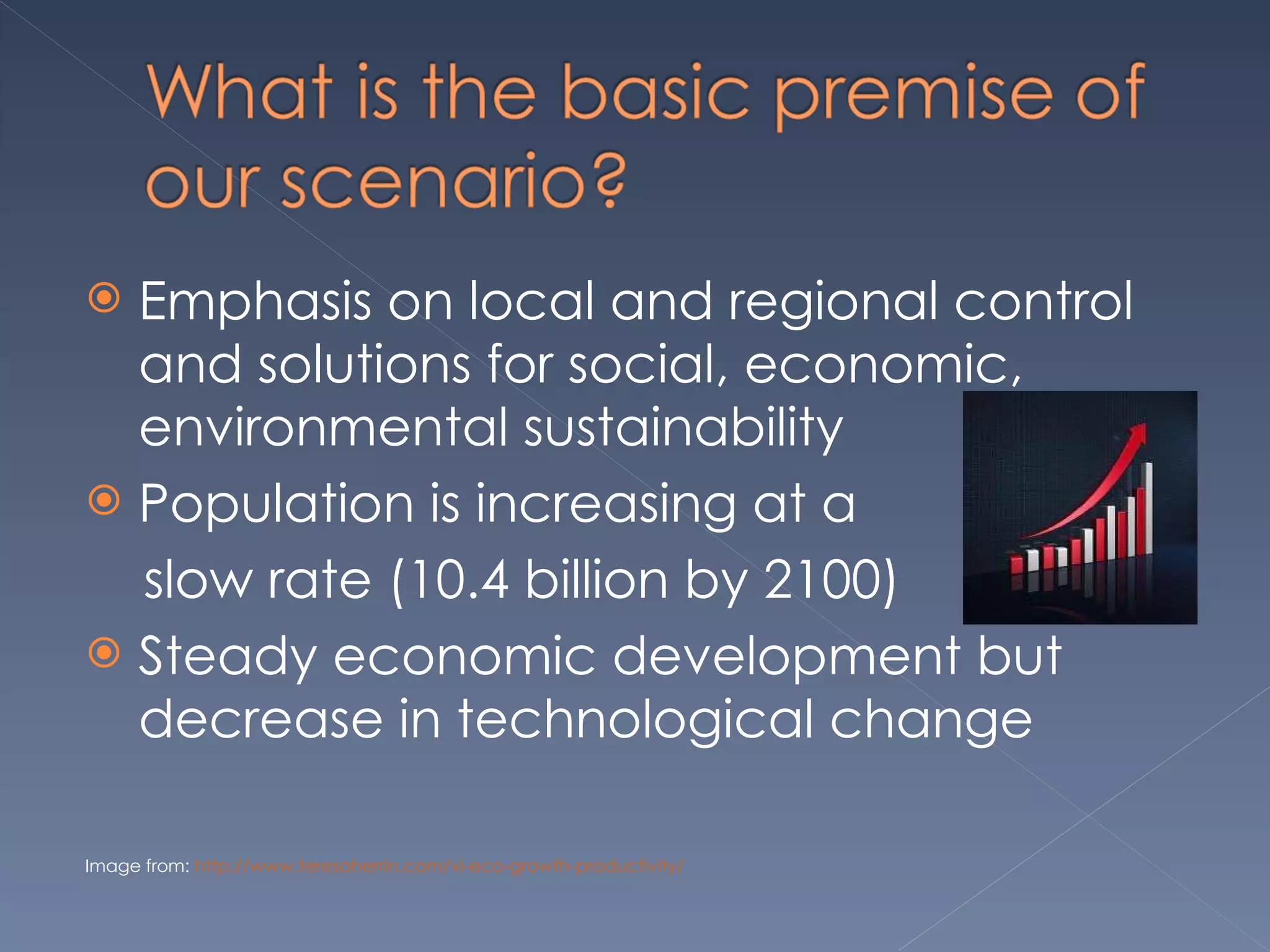 1) Human population gradually increases to 10.4 billion by 2100 while economic development remains steady, though technological change decreases.