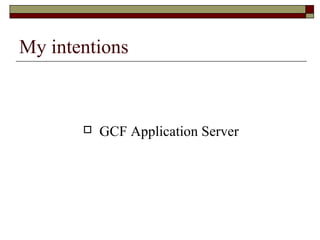 This document describes a GCF Application Server that allows a web application and Qt application to communicate with each other. The server uses GCFMessage.js to send requests from a web page to GCFApplicationServer.php, which redirects the requests to a GCFAppServer. The GCFAppServer contains components that can handle the requests and return responses back to the web page. This allows a web page to invoke methods on Qt application objects and receive responses.