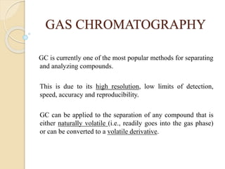 1. Gas chromatography (GC) is a popular method for separating and analyzing compounds due to its high resolution, low detection limits, speed, accuracy, and reproducibility.