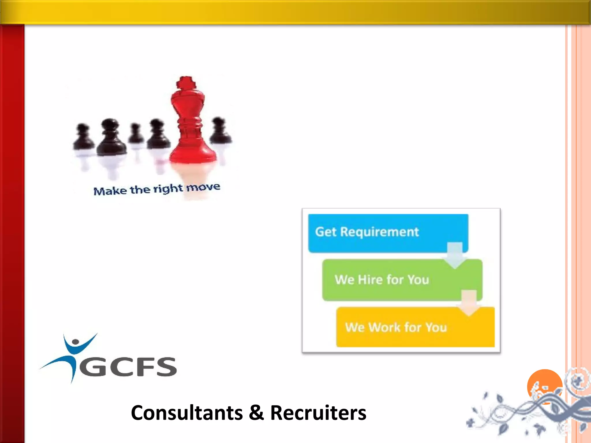 GCFS is a leading provider of human capital and facility management services in India and abroad. It recruits for companies across industries and levels, from entry-level to top management. GCFS aims to deliver excellent customer service and facilities management through innovation, research, and responsible recruitment practices. It offers end-to-end recruitment solutions, including executive search, campus hiring, and outsourcing.