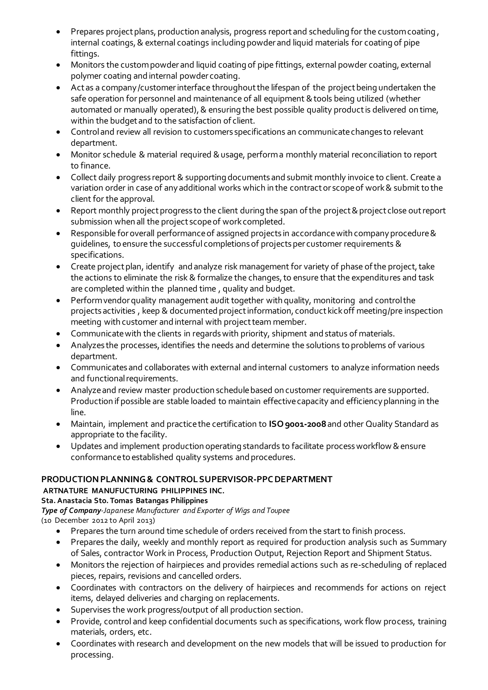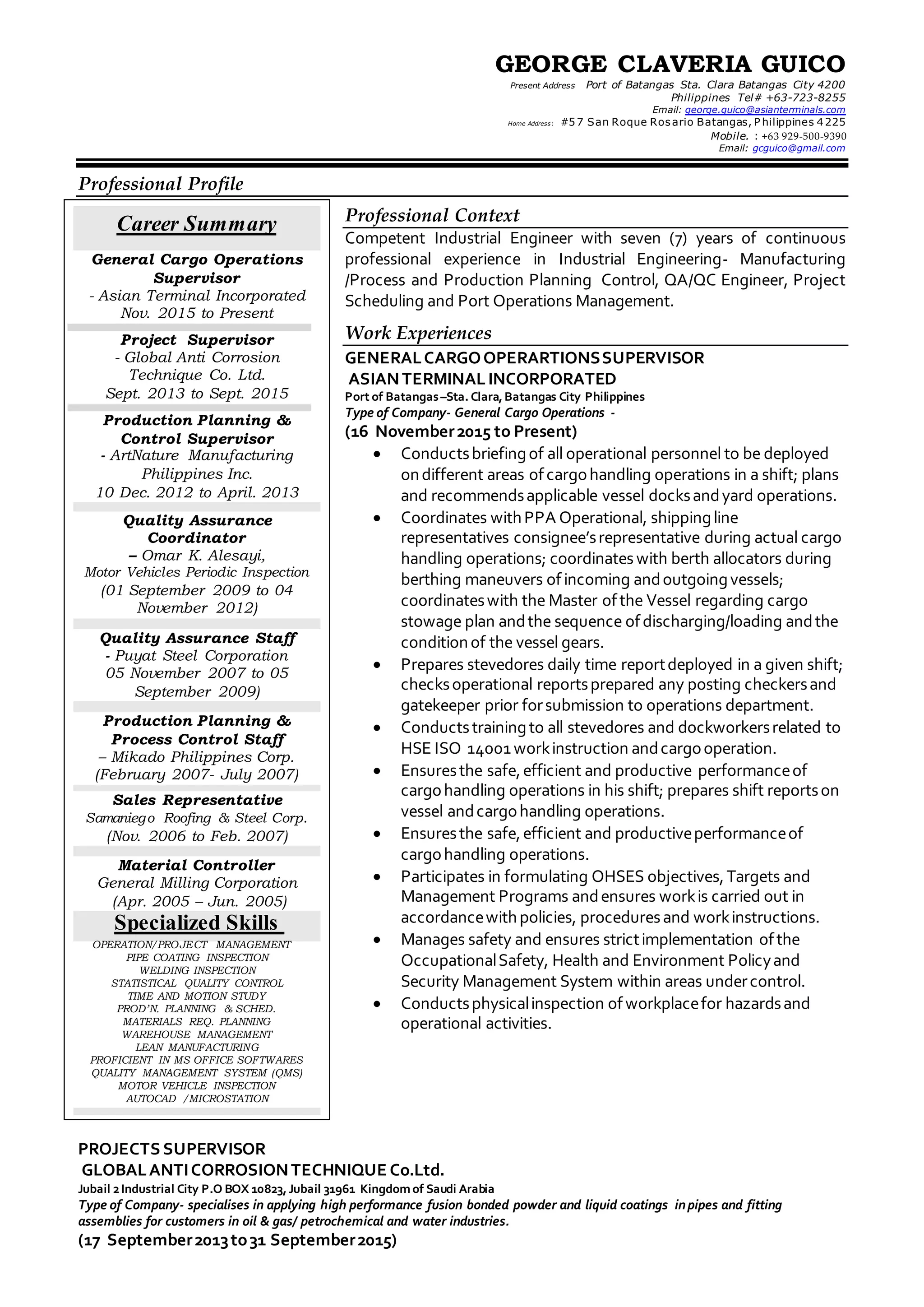 This document provides a summary of George Claveria Guico's professional experience and qualifications. It includes his current role as General Cargo Operations Supervisor for Asian Terminal Incorporated in Batangas City, Philippines, which he has held since November 2015. Prior to this, he was a Project Supervisor for Global Anti Corrosion Technique Co. Ltd. in Jubail, Saudi Arabia from September 2013 to September 2015. He has over 7 years of experience in roles such as Production Planning & Control Supervisor, Quality Assurance Coordinator, Quality Assurance Staff, Production Planning & Process Control Staff, and Material Controller. The document lists his responsibilities and duties in each role.