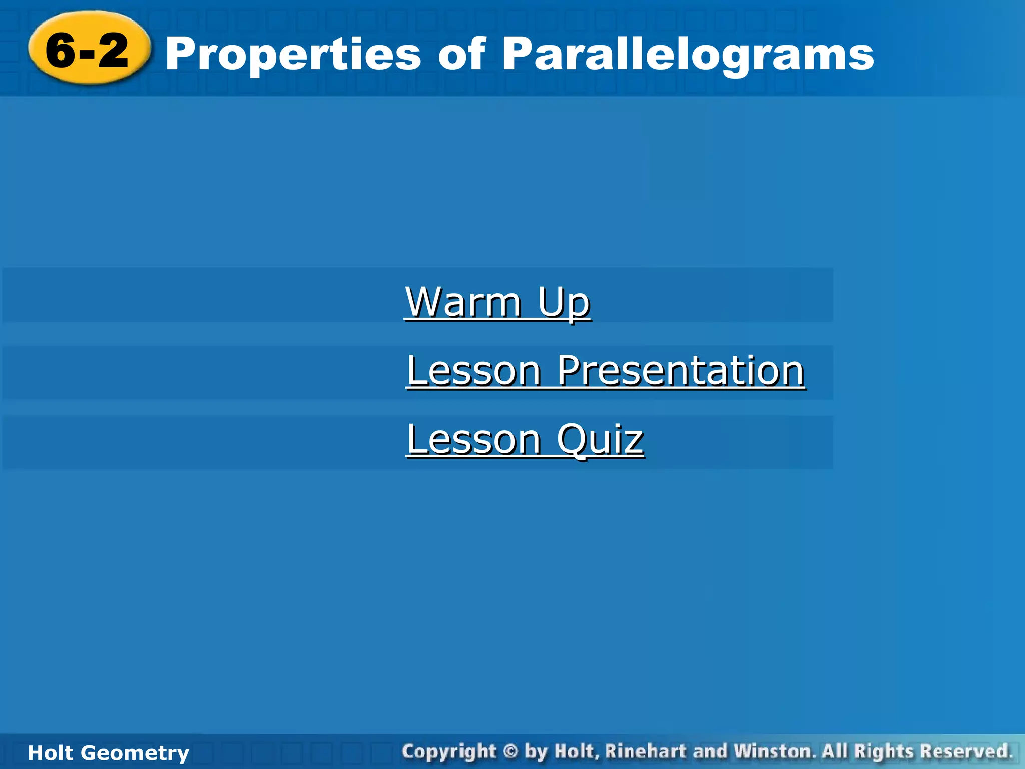 This document discusses properties of parallelograms from a geometry textbook. It includes examples of using properties such as opposite sides being equal, opposite angles being equal, and diagonals bisecting each other to solve problems about parallelograms. It also covers using parallelogram properties to write two-column proofs and finding coordinates of the fourth vertex of a parallelogram given three vertices.