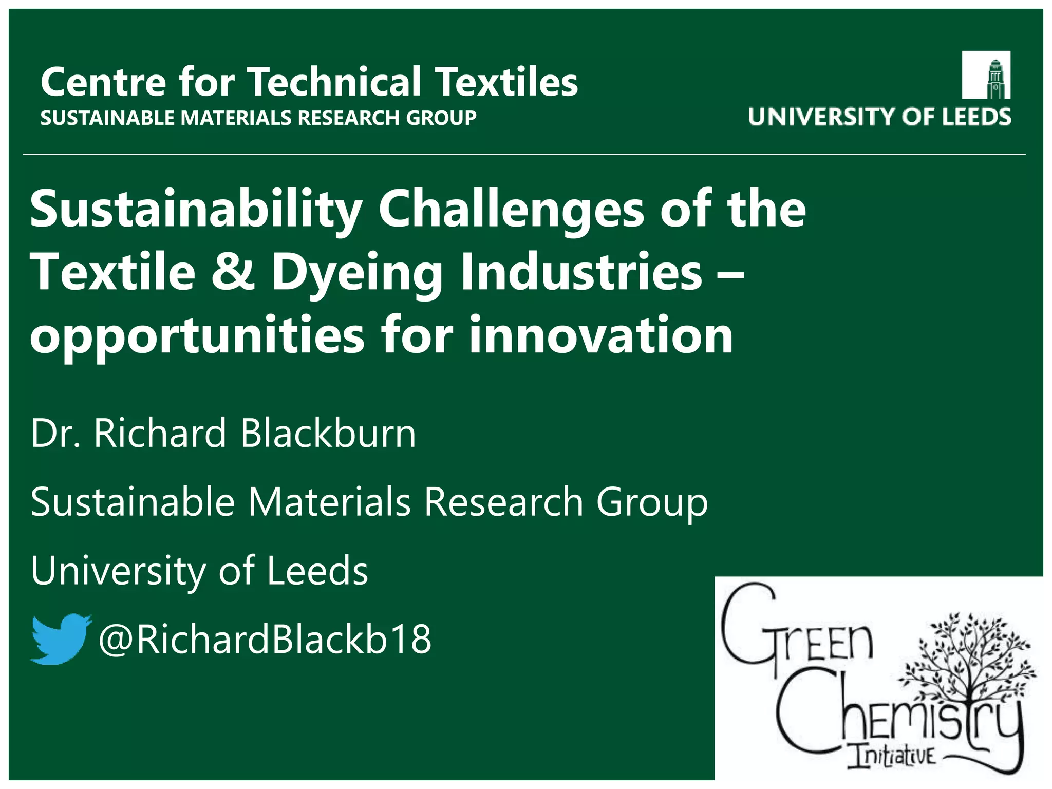This document discusses the sustainability challenges facing the textile and dyeing industries and opportunities for innovation to address these challenges. It notes that the world's population is expected to rise significantly by 2050, increasing demand for resources and chemicals and their environmental impacts. Synthetic fibers like nylon and polyester have improved quality of life but are non-degradable and rely on non-renewable resources. The document examines various fiber production processes and textile dyeing techniques, identifying ways to make them more sustainable by reducing water and energy usage and hazardous chemicals. It also explores alternatives to conventional cotton production and processing.