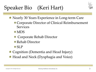The document discusses compliance with Medicare Part B G-code functional reporting, detailing the requirements, objectives, and evaluations necessary for healthcare providers. It outlines specific G-code sets for various functional limitations, including physical therapy, occupational therapy, and speech-language pathology, along with the associated billing procedures. Emphasis is placed on documentation, progress reporting, and selection of appropriate G-codes to ensure accurate claims submission and adherence to regulatory standards.