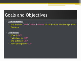 The document discusses Good Clinical Practices (GCP) as defined by the International Conference on Harmonization (ICH). It provides an overview of the history and guidelines of GCP, from the Nuremberg Code to the Declaration of Helsinki to the formation of the ICH. The key principles of GCP according to the ICH are described, including protecting trial subjects, obtaining informed consent, and ensuring proper documentation and storage of trial information. The areas addressed by the GCP guidelines are outlined, such as the responsibilities of ethics committees, investigators, and sponsors.