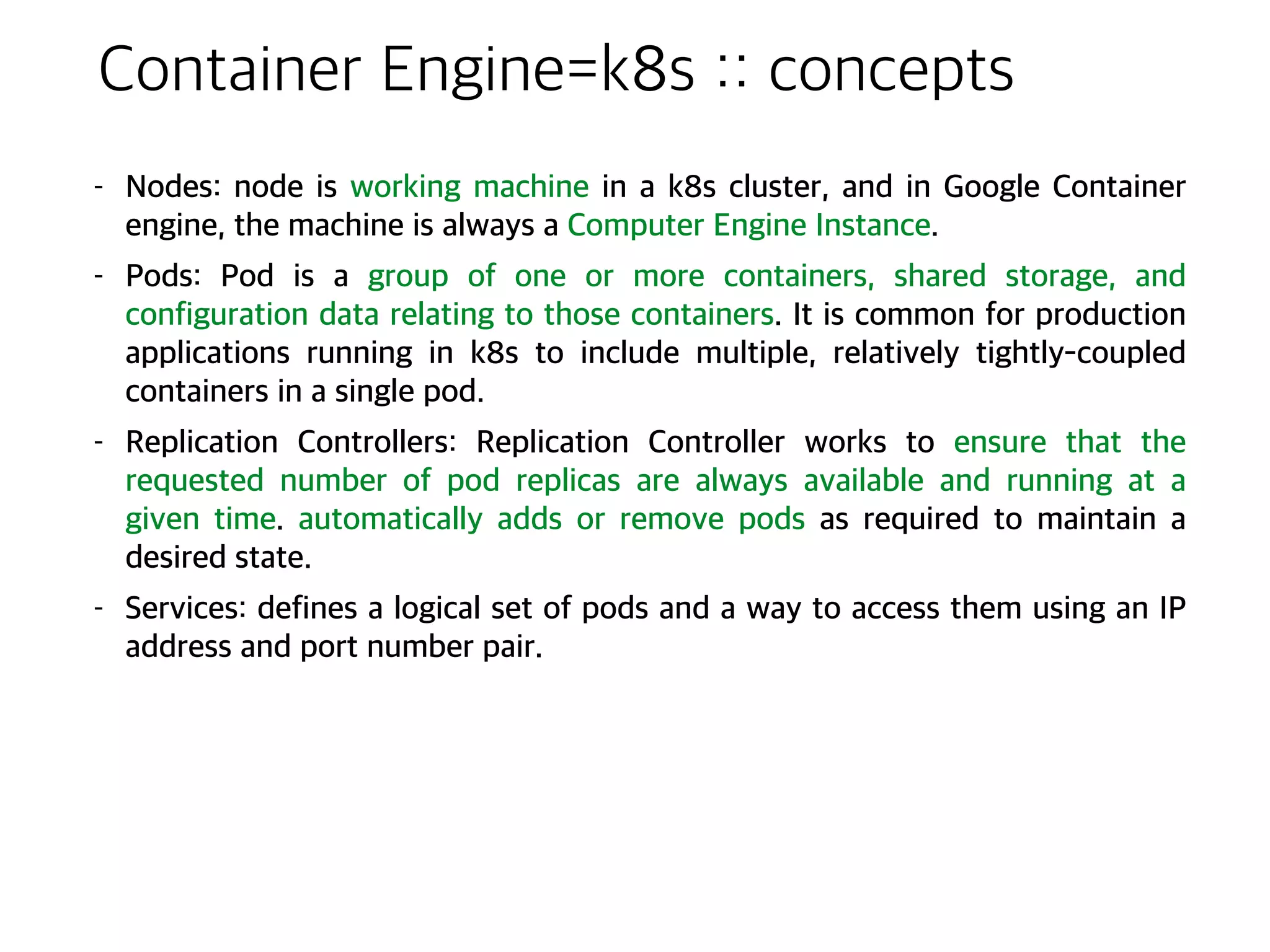 - Nodes: node is working machine in a k8s cluster, and in Google Container