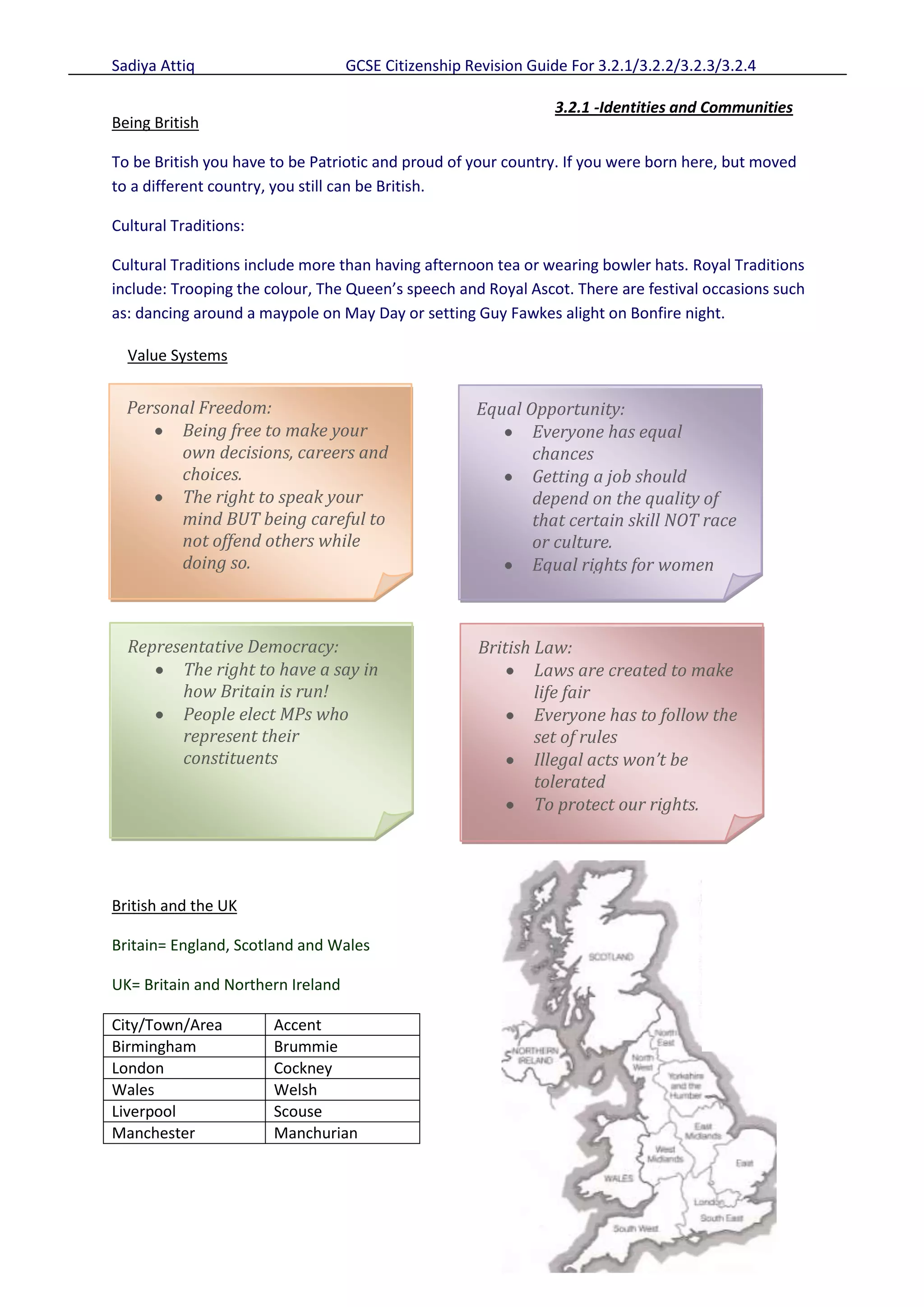 The document provides information about identities, communities, and citizenship in the UK. It discusses what it means to be British and outlines some cultural traditions. It also describes value systems in British society such as personal freedom, equal opportunity, representative democracy, and British law. Additionally, it defines key terms related to identities, communities, religions, ethnic groups, and the history of immigration and diversity in Britain. It provides information on human rights, democracy, voting systems, and the UK's relationship with international organizations like the European Union and United Nations.