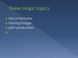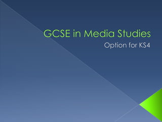 This document outlines the GCSE in Media Studies option for Key Stage 4, which covers three major topics: documentaries, moving images, and print production. Students will analyze documentaries, action films, TV comedies and genres through comparative essays and practical projects involving planning, construction, and evaluation. They will also learn key concepts such as media language, representation, and institutions and audiences. The course aims to develop students' critical thinking, appreciation of media, and practical skills through engaging activities like visits to the cinema and making documentaries on mobile phones.