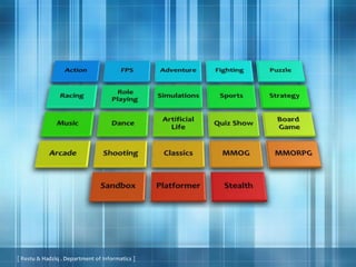 The document describes various video games and board games categorized by genre. It provides brief descriptions of popular games such as Metal Gear Solid, Minesweeper, Mirror's Edge, MLB Slam!, Monopoly, NBA Live, Need for Speed, Nexia, O2 Jam, The Elder Scrolls IV: Oblivion, Pac Man, Pinball, Pizza Frenzy, Plants vs Zombies, Pokemon, Poker, Prince of Persia, Pro Evolution Soccer, Ragnarok Online, Remi, RF Online, Solitaire, Star Craft, Sudoku, Super Mario, Tales of Vesperia, Tetris, The Sims, Tokimeki Memorial, Typing of The Deathd,