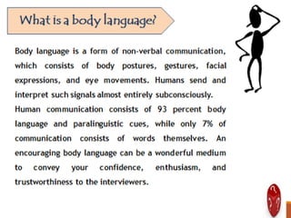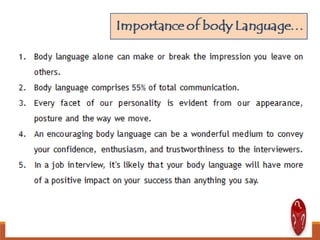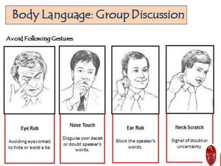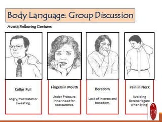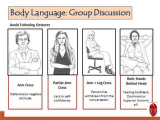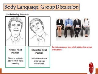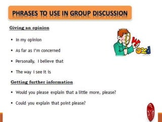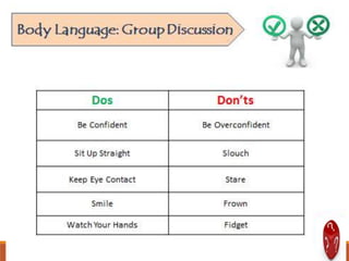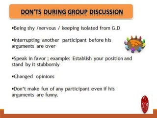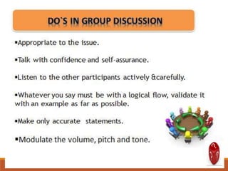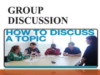 Group discussion is used to assess students' personalities and suitability for jobs. It requires sharing ideas and listening to others' perspectives maturely and logically. GD can be based on topics like current issues, controversies, or abstract concepts, or cases studies simulating real situations. They aim to evaluate communication skills, knowledge, reasoning, leadership, flexibility, and ability to work with others. Preparation includes reading widely and practicing in mock discussion groups. During GD, one should take a balanced, holistic view and avoid domination or arguments, allowing others to contribute. Summarizing incorporates all important points discussed without adding new ones. The perfect candidate participates attentively, answers questions completely, shows a positive attitude and makes a good first