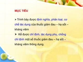 Tài liệu trình bày định nghĩa, phân loại và cơ chế tác dụng của thuốc giảm đau, hạ sốt, kháng viêm, đồng thời nêu rõ chỉ định, tác dụng phụ và chống chỉ định của một số thuốc thông dụng như aspirin, paracetamol và các thuốc NSAIDs. Các thuốc này có hiệu lực giảm đau trong các chứng đau nhẹ và trung bình, có tác dụng hạ sốt và kháng viêm, nhưng cũng có thể gây ra tác dụng phụ nghiêm trọng như loét dạ dày, dị ứng và tổn thương gan. Tài liệu cũng nhấn mạnh tầm quan trọng của việc tuân thủ chỉ định và tác dụng phụ của từng loại thuốc.