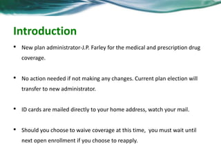 The document provides an overview and summary of the employee benefit plans for an organization's open enrollment period. It includes information about the new medical and prescription drug plan administrator, wellness incentives that reduce premium costs, and an overview of the dental, vision, life, disability, and voluntary accident and critical illness plans. Employees can obtain ID cards, check claims status, and find plan forms on the new administrator's website. The summary also reviews dependent eligibility, premium costs for each plan, and details about coverage and provider networks.