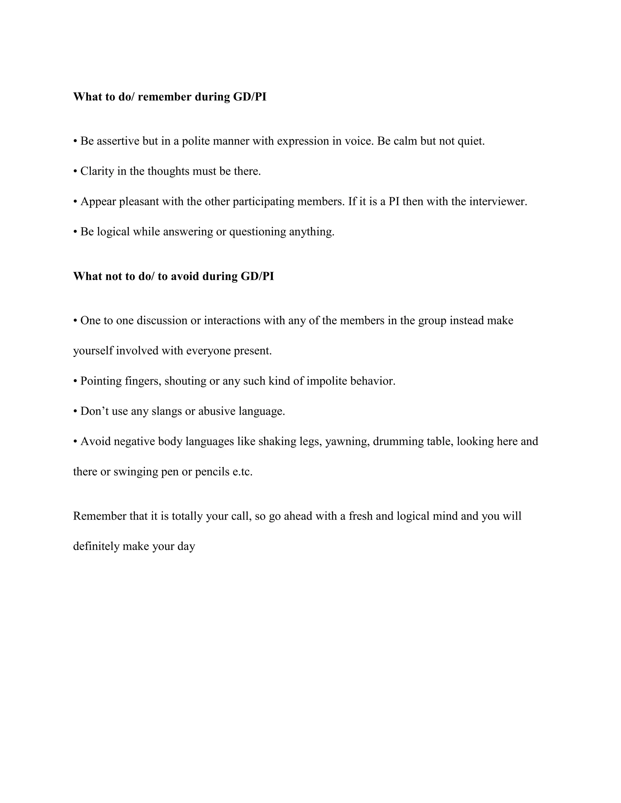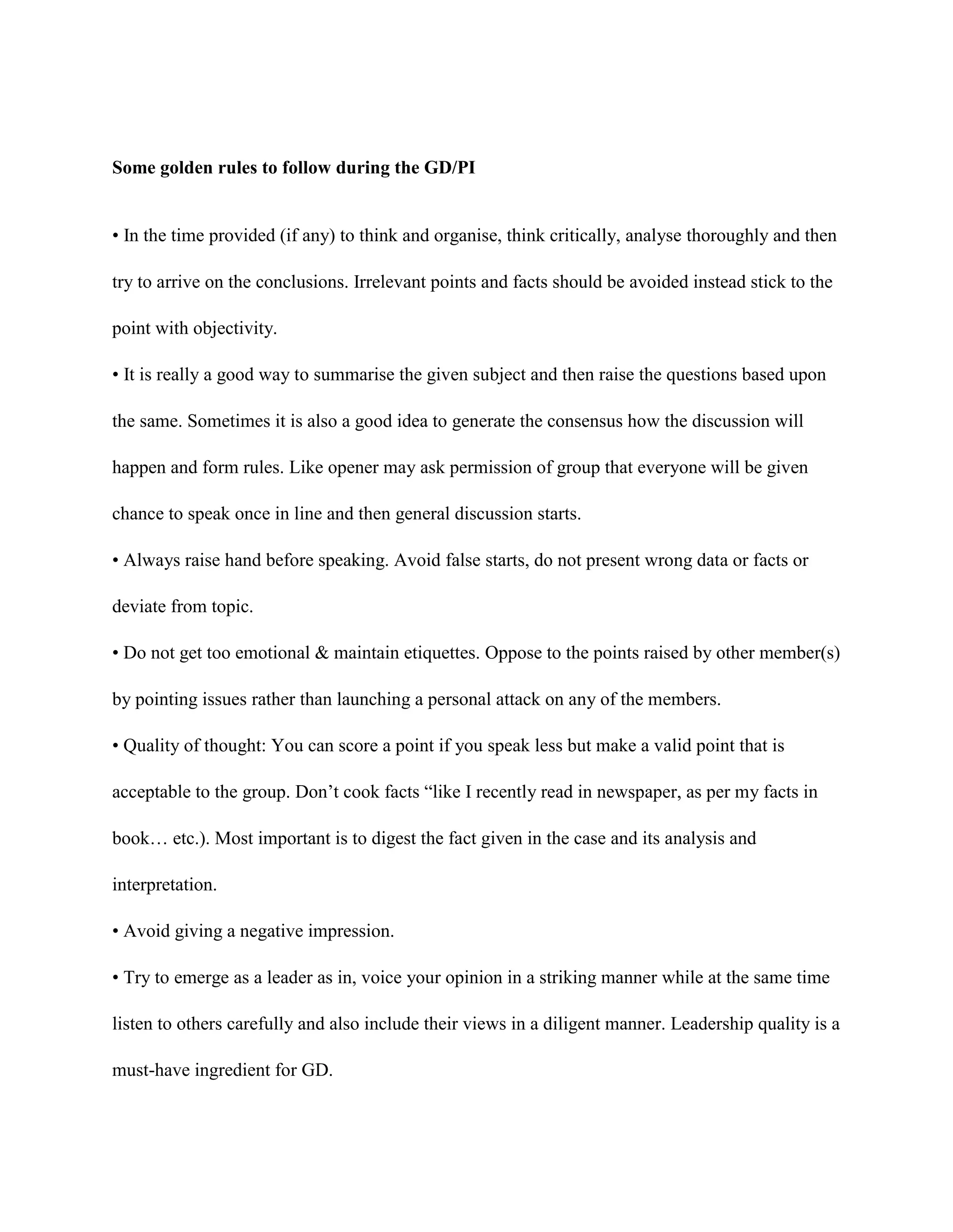 The document provides several golden rules and tips for participating effectively in group discussions and personal interviews: