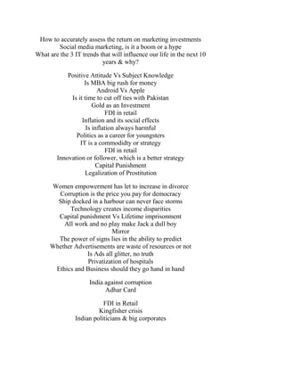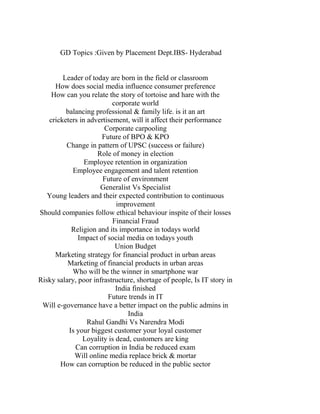 This document provides a list of potential discussion topics that could be given by a university placement department. Some of the topics include how social media influences consumer preferences, balancing professional and family life, the future of the business process outsourcing and knowledge process outsourcing industries, the impact of social media on today's youth, corruption in India, and whether technology creates income disparities.