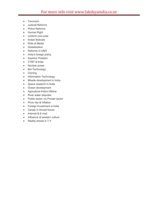 The document lists over 50 important topics for group discussions, including issues such as population problems, corruption, pollution, deforestation, global warming, unemployment, poverty, education, women's rights, terrorism, and reforms needed in areas like the judiciary, police, United Nations, and India's foreign policy and defense preparedness. It also provides a website, www.lakshyaindia.co.nr, for additional information on these group discussion topics.