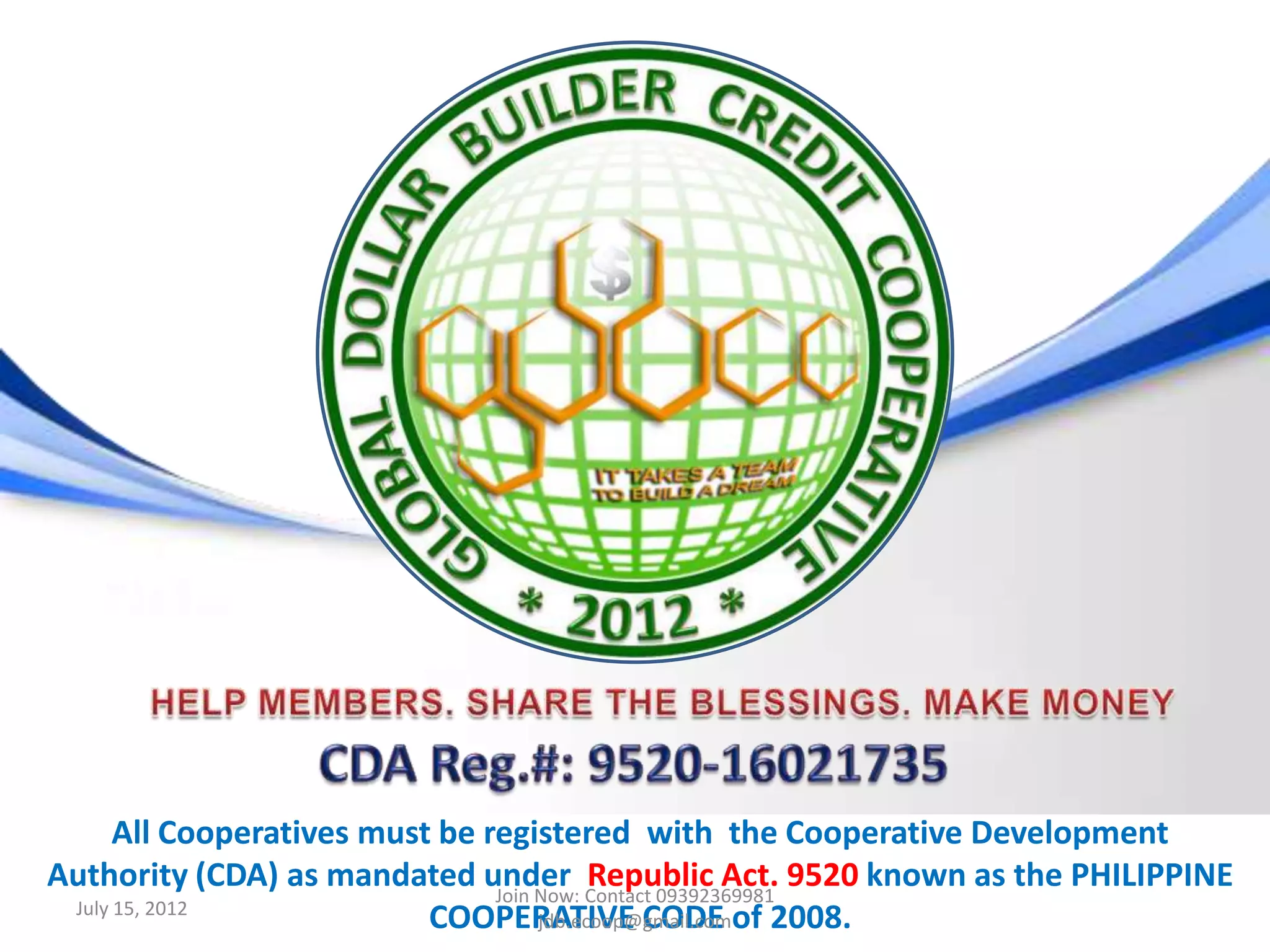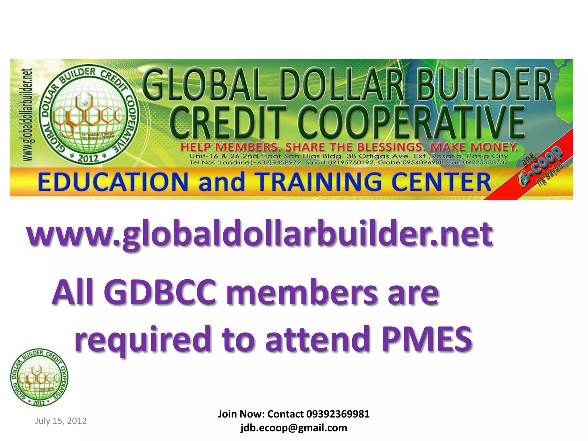 The document provides information about joining the Global Dollar Builder Credit Cooperative (GDBCC). It discusses the requirements for becoming a member, including undergoing a Pre-Membership Education Seminar (PMES). The PMES covers basic concepts of cooperatives and details about GDBCC, its products/services, and how members can earn income and benefits. All cooperatives must register with the Cooperative Development Authority according to Philippine law.