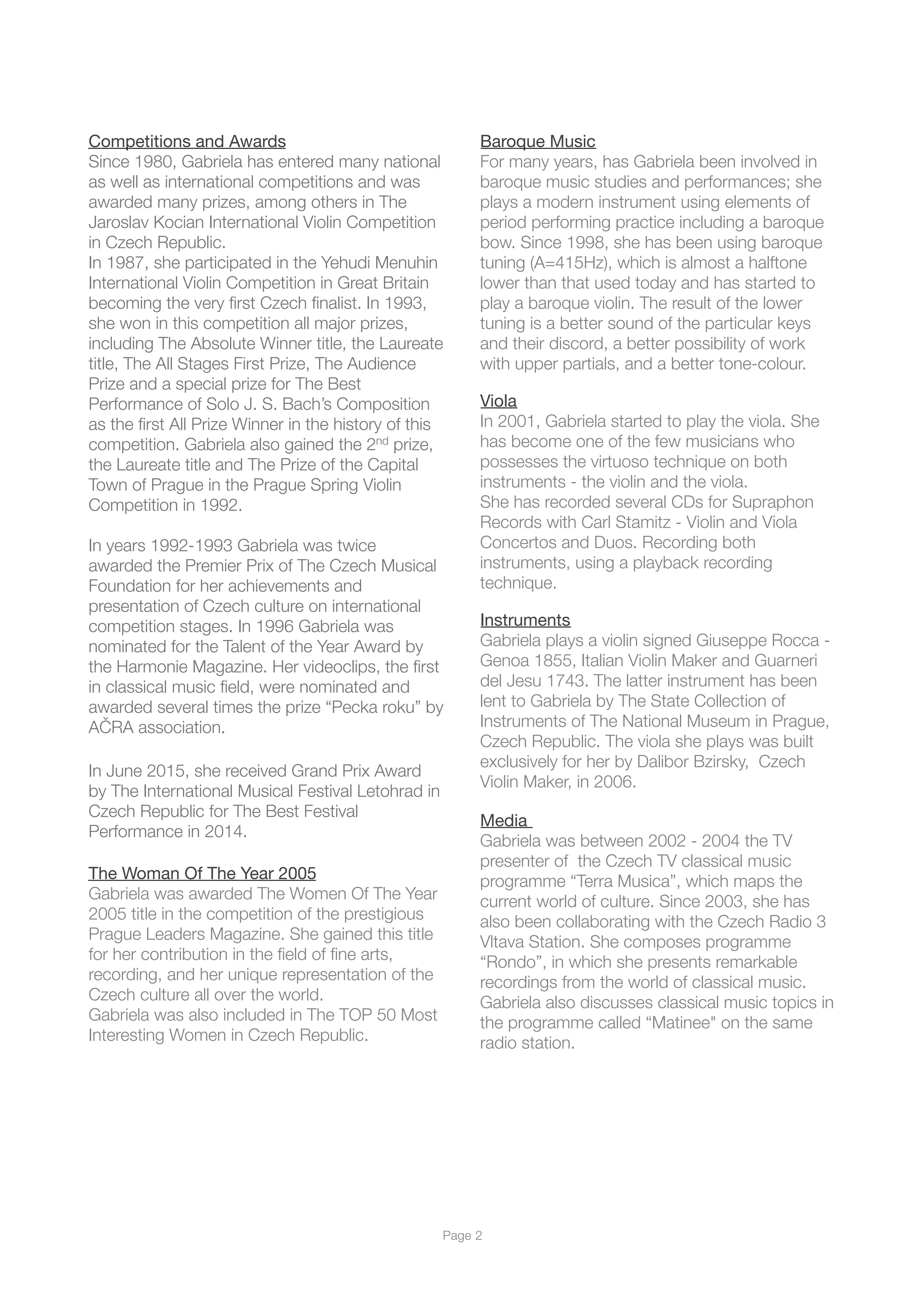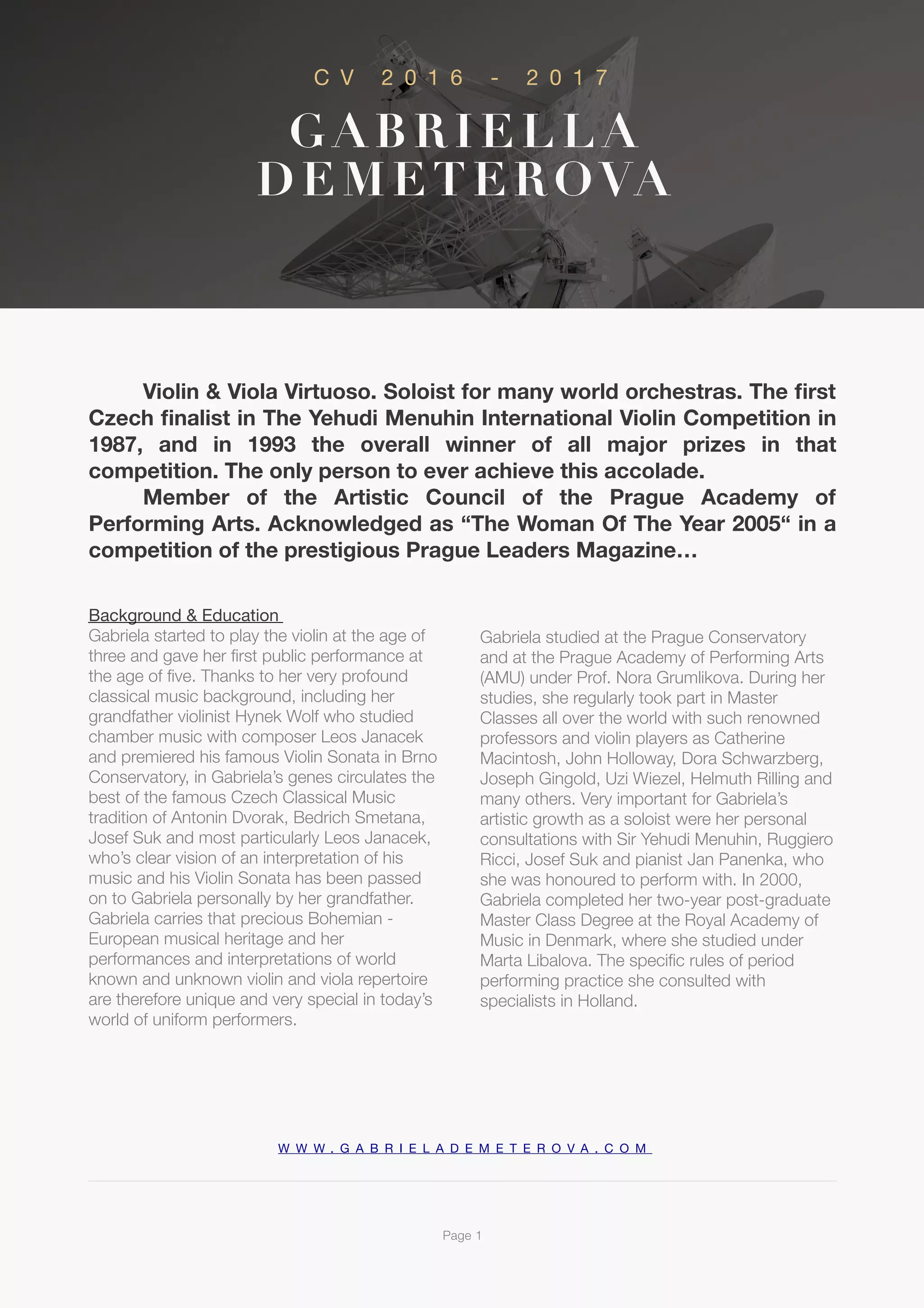 This document provides biographical information about violinist and violist Gabriela Demeterova. It summarizes that she is a renowned soloist who has performed with major orchestras worldwide and won several prestigious violin competitions, including being the first Czech finalist and overall winner of the Yehudi Menuhin International Violin Competition in 1987 and 1993 respectively. It also outlines her extensive musical training and education, performances of both baroque and modern repertoire, founding of musical ensembles and festivals, and awards and recognition for her contributions to music.