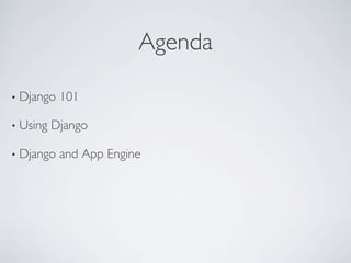 This document provides an overview of developing and deploying Django applications to Google App Engine. It begins with an introduction to Django and how to set up a Django development environment using virtualenv and pip. It then covers common Django components like models, views, templates, URLs and forms. It concludes with a brief discussion of deploying Django applications to App Engine. The key topics covered include setting up a virtual environment for Django development, the model-view-template architecture of Django, and using Django tools and components to build an application that can be deployed to App Engine.