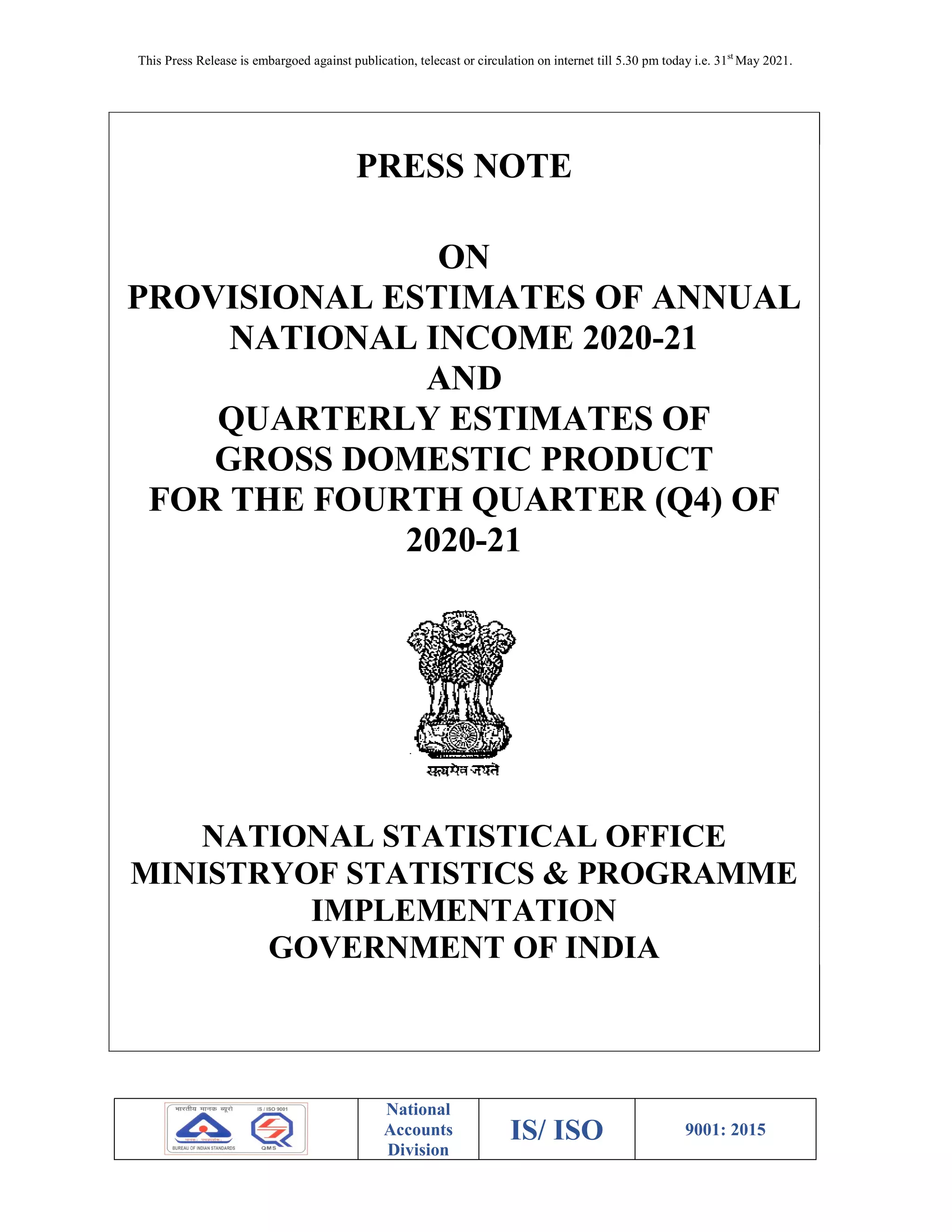 The document provides a summary of India's annual national income estimates for 2020-21 and quarterly GDP estimates for Q4 of 2020-21. Some key points: