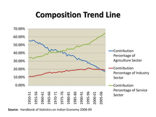 1) India has experienced rising real GDP growth over time, but the composition of GDP has shifted significantly between sectors.