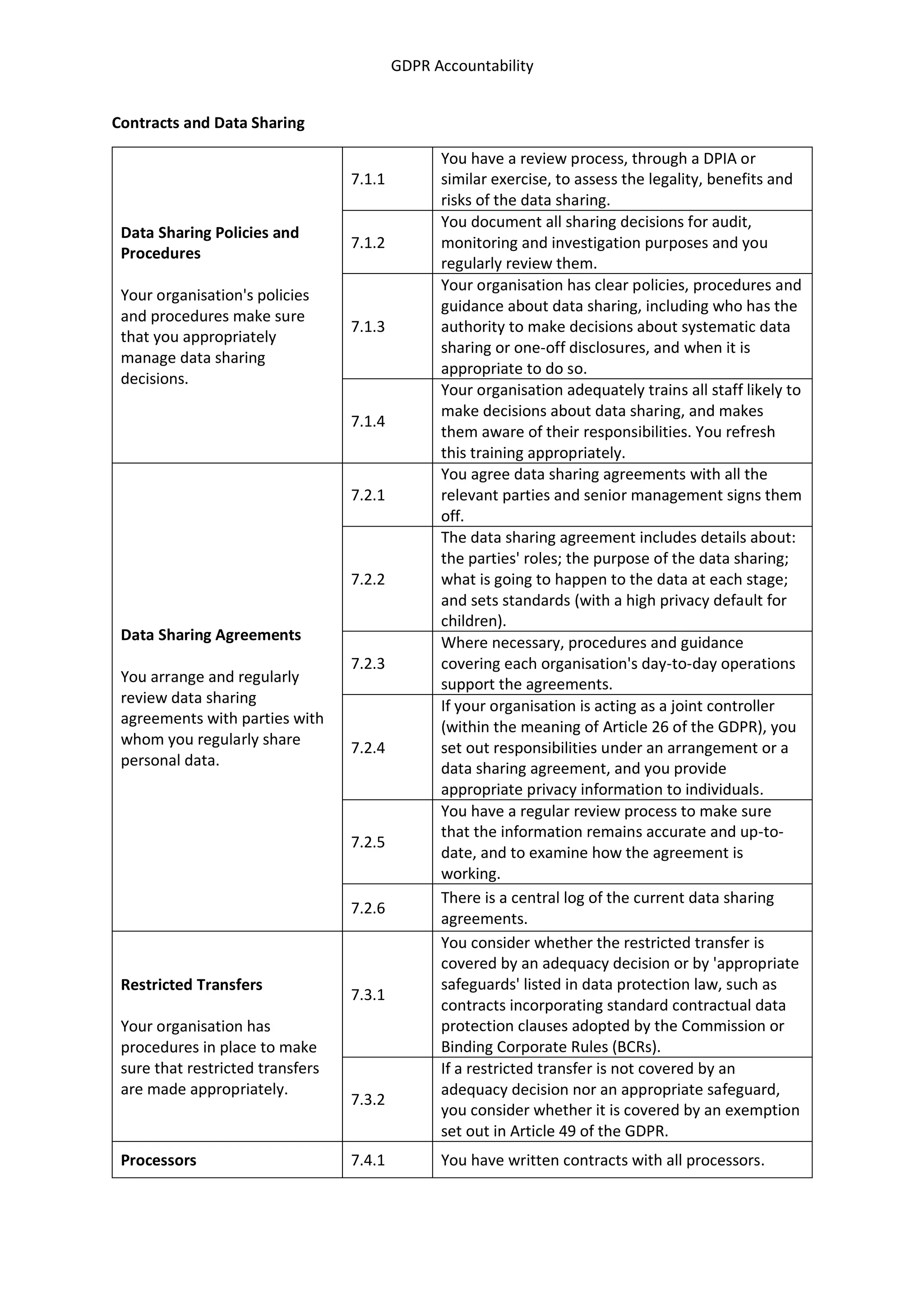 This document outlines policies and procedures for managing data sharing and processing according to GDPR accountability principles. It discusses having: