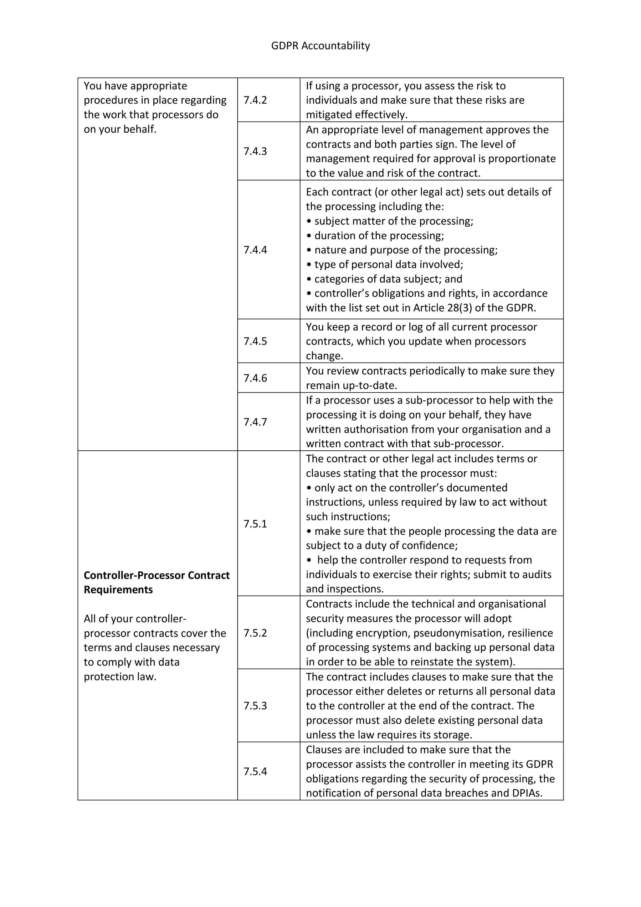- Written contracts with all processors that specify obligations, security measures, and assistance in fulfilling GDPR requirements