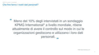Il documento discute il GDPR, un regolamento di protezione dei dati personali che entrerà in vigore il 25 maggio 2018, attribuendo diritti fondamentali agli utenti riguardo al trattamento dei propri dati. Esamina i ruoli chiave, come il titolare e il responsabile del trattamento, e i diritti degli interessati, includendo l'accesso, la rettifica e la cancellazione dei dati. Inoltre, presenta la piattaforma Contactlab come strumento per aiutare le aziende a conformarsi alle norme del GDPR.