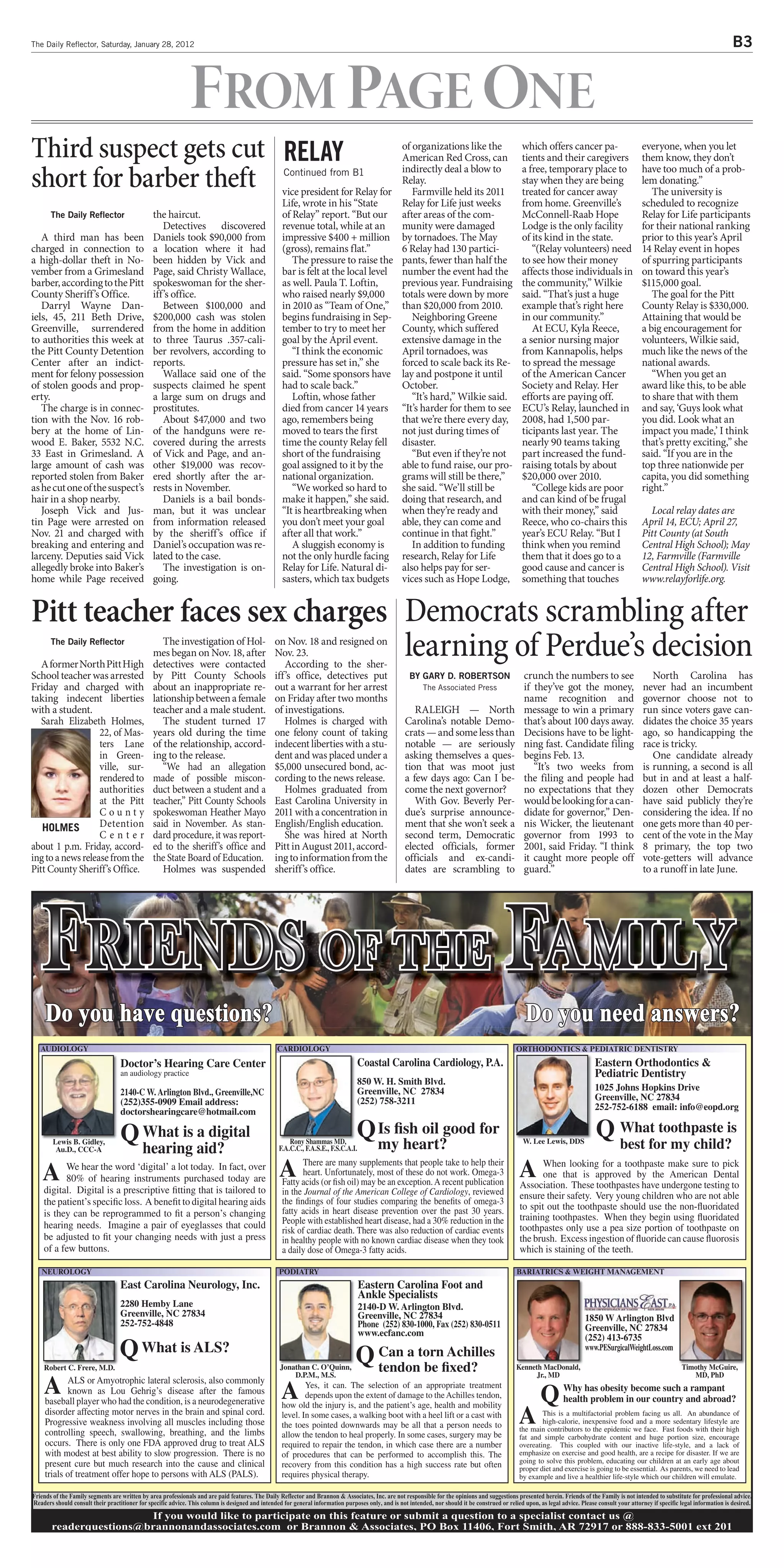 A third man has been charged in connection with a robbery of over $100,000 from a barber in Grimesland, North Carolina. Two other men had previously been arrested for the crime in November and large sums of cash and weapons had been recovered. Local Relay for Life fundraising events are facing challenges from economic pressures and natural disasters, but organizers hope highlighting achievements like being in the top three nationwide for per capita fundraising will encourage continued community support.