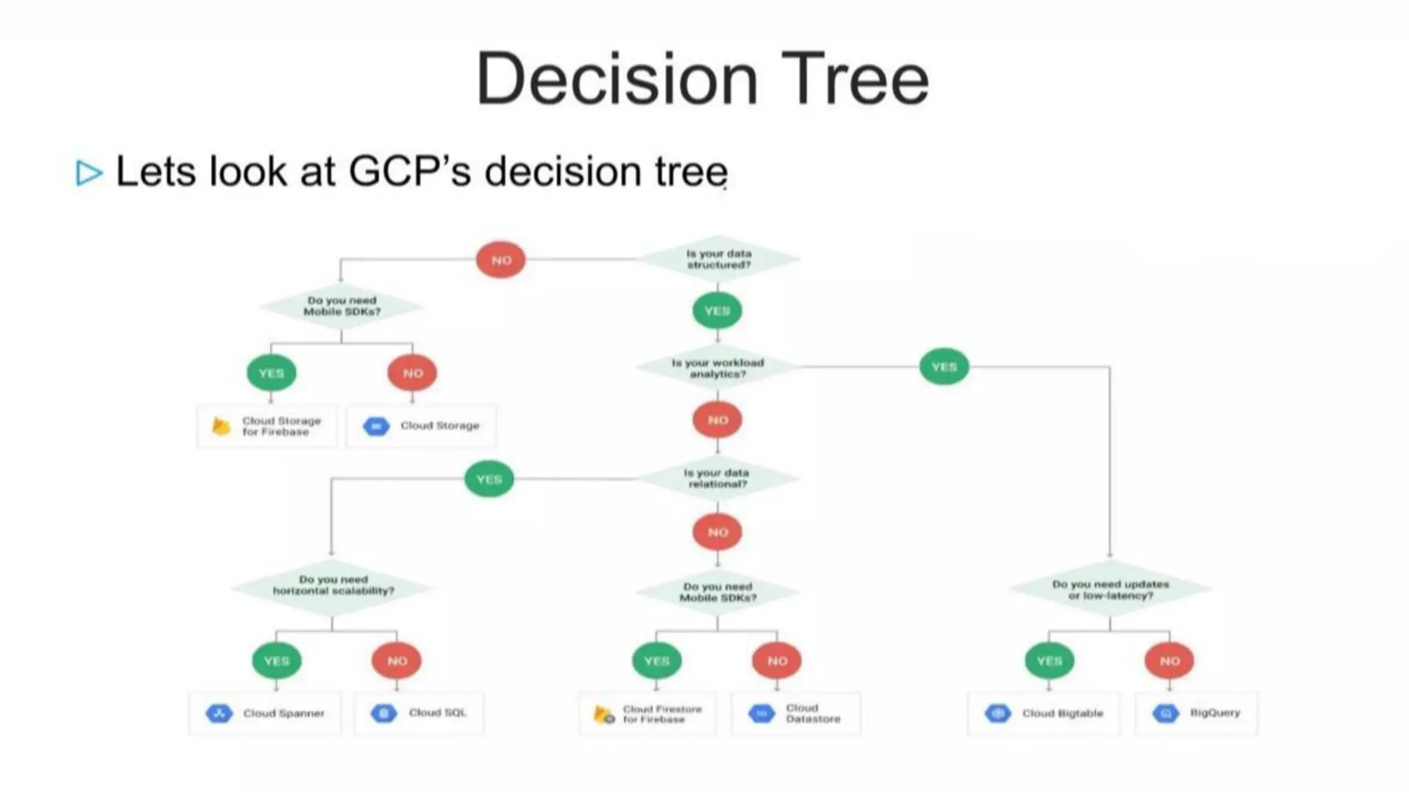 The document summarizes different database options available on Google Cloud, including: