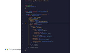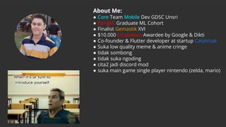 The document outlines a presentation about integrating TensorFlow with Flutter, focusing on the advantages of using these technologies for cross-platform mobile app development. Key topics include the definition and benefits of Flutter and TensorFlow Lite, installation guidelines, and coding best practices. The speaker, Muhammad Zhafran, shares his background and offers insights into using these frameworks for machine learning applications, followed by a coding tutorial.