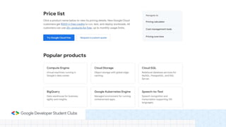 Google Cloud Platform provides cloud storage and computing resources. Cloud Storage allows storing files in buckets, while resources like virtual machines are hosted across Google's global data centers. Projects organize user applications and resources, and there are various ways like the console, CLI, and client libraries to interact with and manage Google Cloud services and resources. Pricing is based on storage, network usage, operations, and retrieval/early deletion fees which vary by storage class and location.