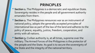 The document outlines the principles and policies of the 1987 Philippine Constitution. It establishes that sovereignty resides with the people, that the Philippines is a democratic and republican state, and that civilian authority is supreme over the military. It also covers policies related to social justice, human rights, health, education, labor, rural development, and more. The Constitution aims to serve and protect the people while pursuing an independent foreign policy.