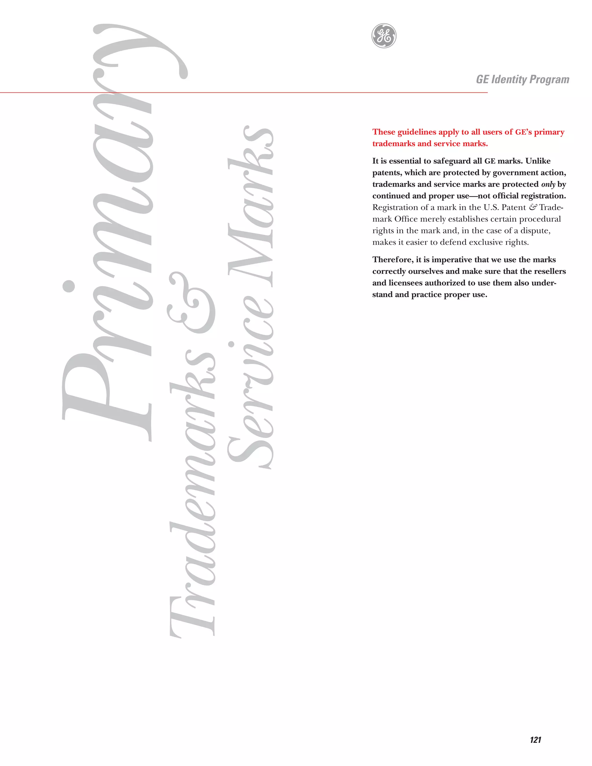 This document outlines the guidelines for the use of General Electric's (GE) primary trademarks and service marks, emphasizing the importance of proper usage to maintain trademark protection. It details the definitions of marks, appropriate display methods, and specific rules for affiliates and resellers to follow. Additionally, it provides instructions on using GE's marks in different contexts, including international considerations and the responsibilities of resellers in promoting GE products.
