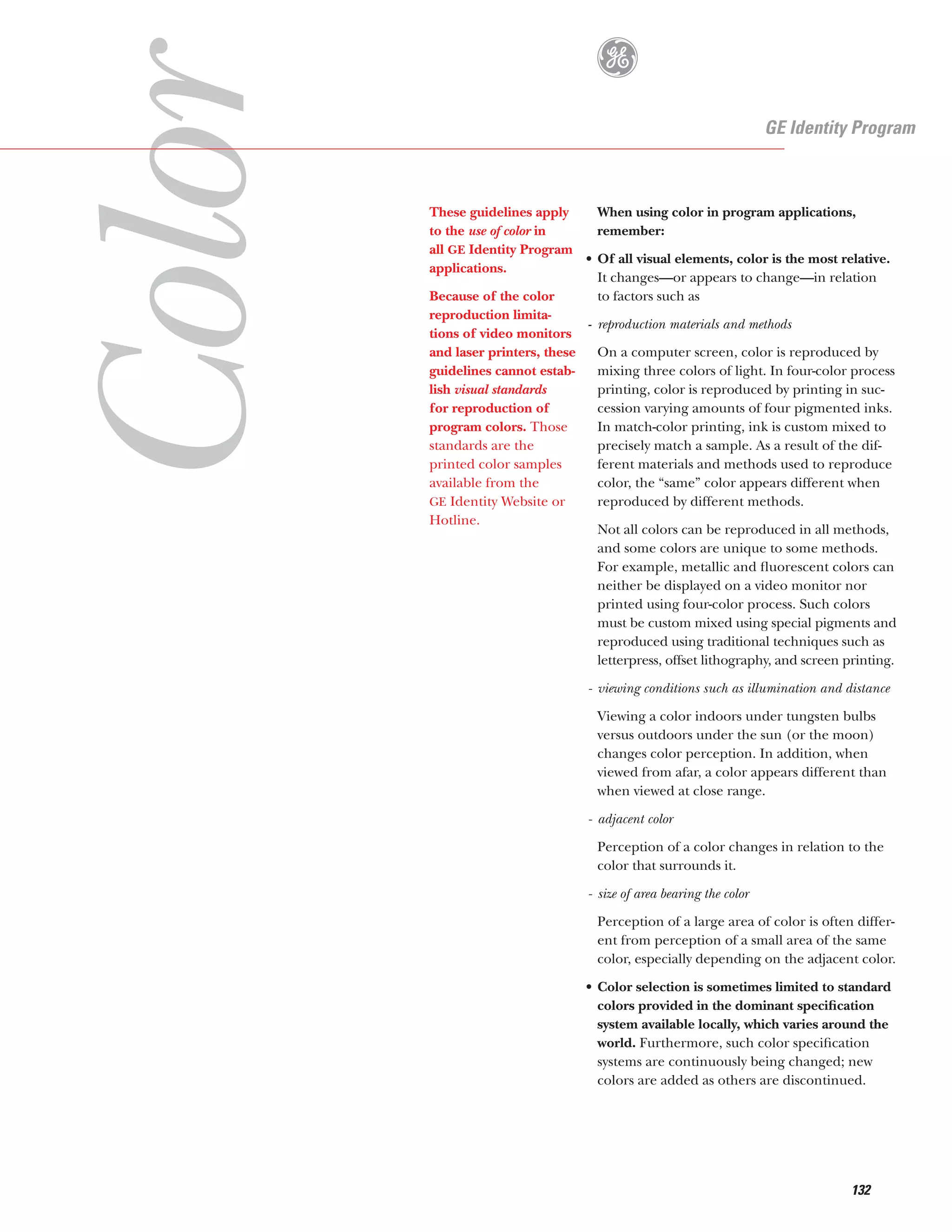 The document provides guidelines for using color in GE Identity Program applications, including the corporate colors of Platinum Grey and Laser Red. It describes when and how to use the corporate colors against different background colors like white, black, and Platinum Grey. The document also introduces GE color palettes that can be used for promotional materials when the corporate colors are not appropriate.