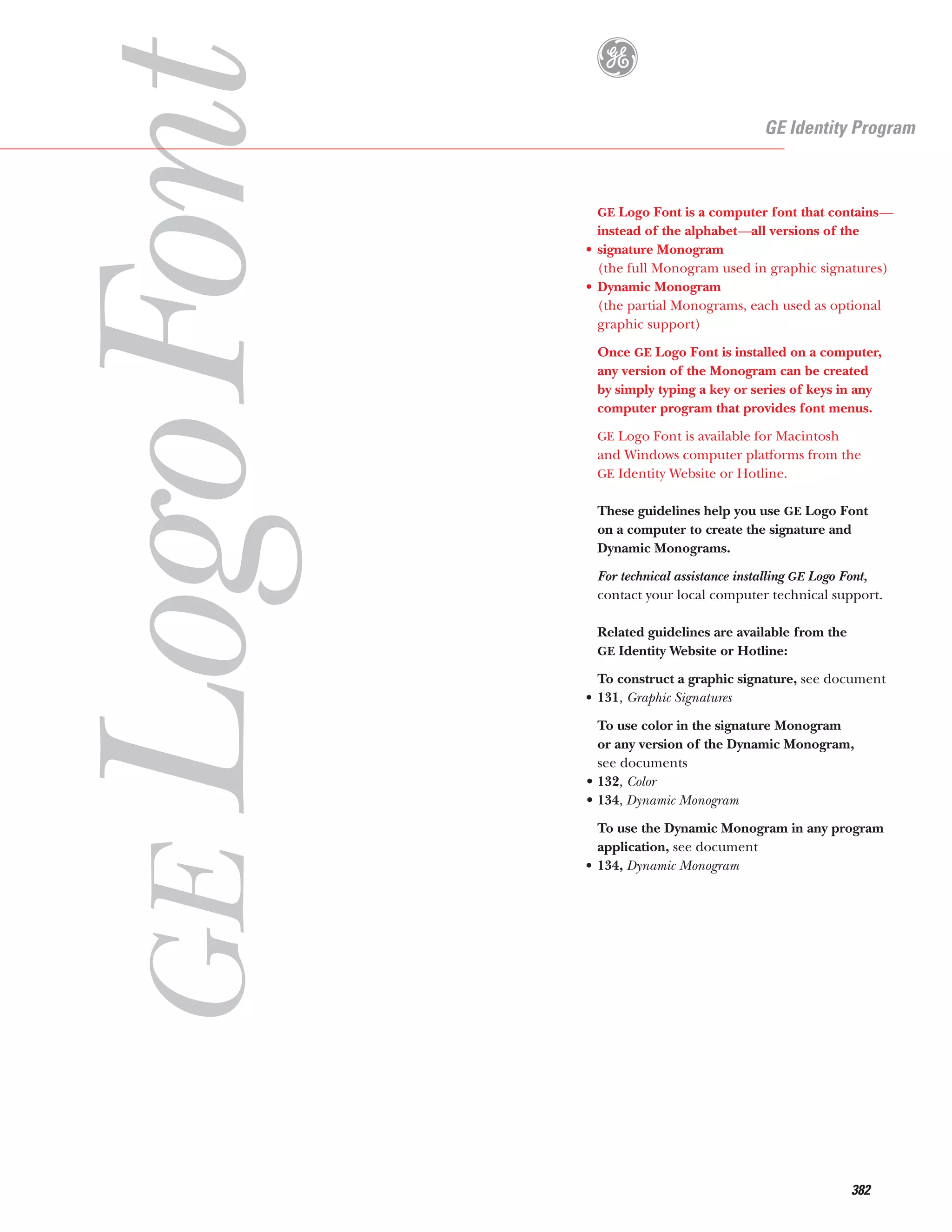 GE Logo Font is a computer font that contains versions of GE's signature Monogram and Dynamic Monogram logos, rather than the alphabet. It allows users to create the Monograms by simply selecting the font and typing keys in programs that support fonts. The font is available for Mac and Windows from GE's website. The document provides guidelines for correctly installing and using GE Logo Font to produce the Monograms in a variety of programs and with the proper sizing, colors, and formats. It also references additional documents for constructing graphic signatures and using color and Dynamic Monogram versions.