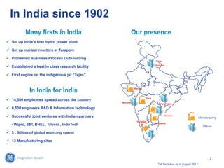 GE has been operating in India since 1902, focusing on innovations in energy, healthcare, and infrastructure to enhance the quality of life. With around 15,000 employees, including 6,000 engineers, GE emphasizes localized solutions through partnerships and a strong commitment to social development. The company's diverse portfolio includes advanced technologies ranging from efficient energy solutions to healthcare advancements, supported by multiple research and manufacturing facilities across the country.