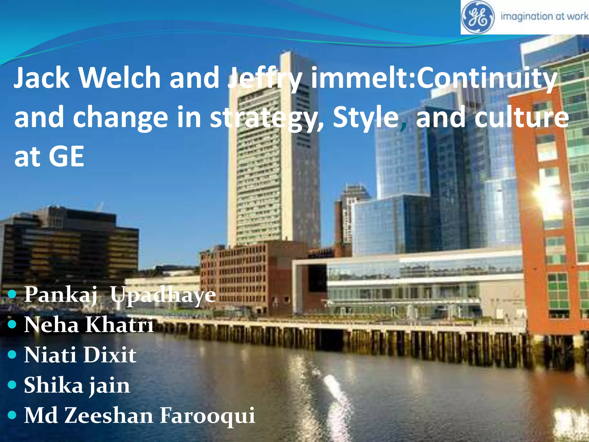 Jack Welch led GE from 1981-2001, transforming it into the world's largest and most valuable company. He focused on restructuring, downsizing, and acquisitions. Under Jeff Immelt from 2001 onward, GE shifted from a performance-driven culture to prioritizing customer satisfaction and diversity. While continuing Welch's focus on growth, Immelt emphasized external recruitment, social responsibility, and innovation through new research initiatives. Overall, Welch and Immelt both grew GE substantially through different strategic approaches and leadership styles.