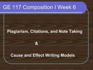 This document provides an overview of plagiarism, citations, and note taking. It discusses strategies for avoiding plagiarism such as taking proper notes and using a citation method. It also reviews the MLA citation style, including providing in-text citations and creating a bibliography. Additionally, it covers the cause and effect writing model, including identifying causes and effects and organization patterns. For homework, students are asked to select a topic and write 3 well-developed paragraphs on it.