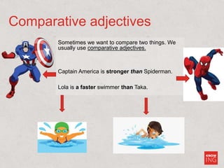 2) It provides examples of sentences using comparative adjectives like "Captain America is stronger than Spiderman" and discusses irregular adjectives like "good" and "bad".