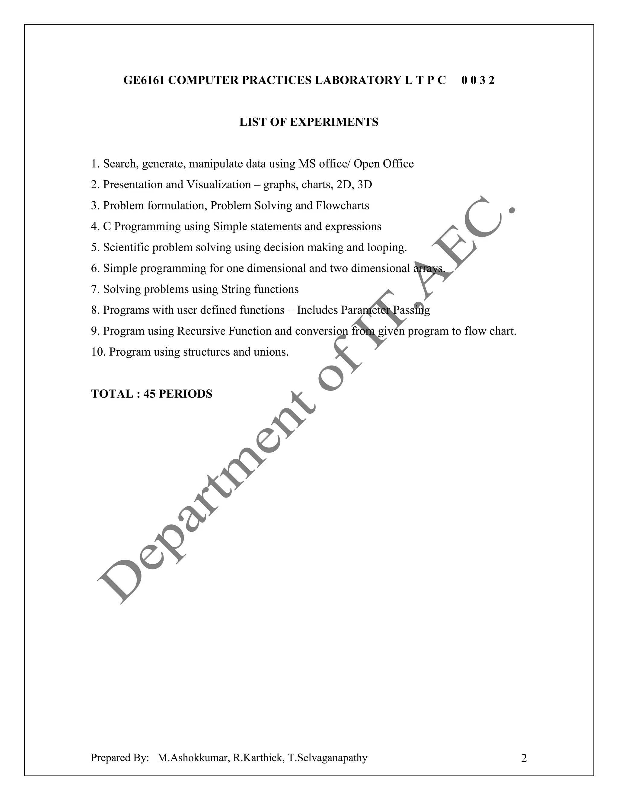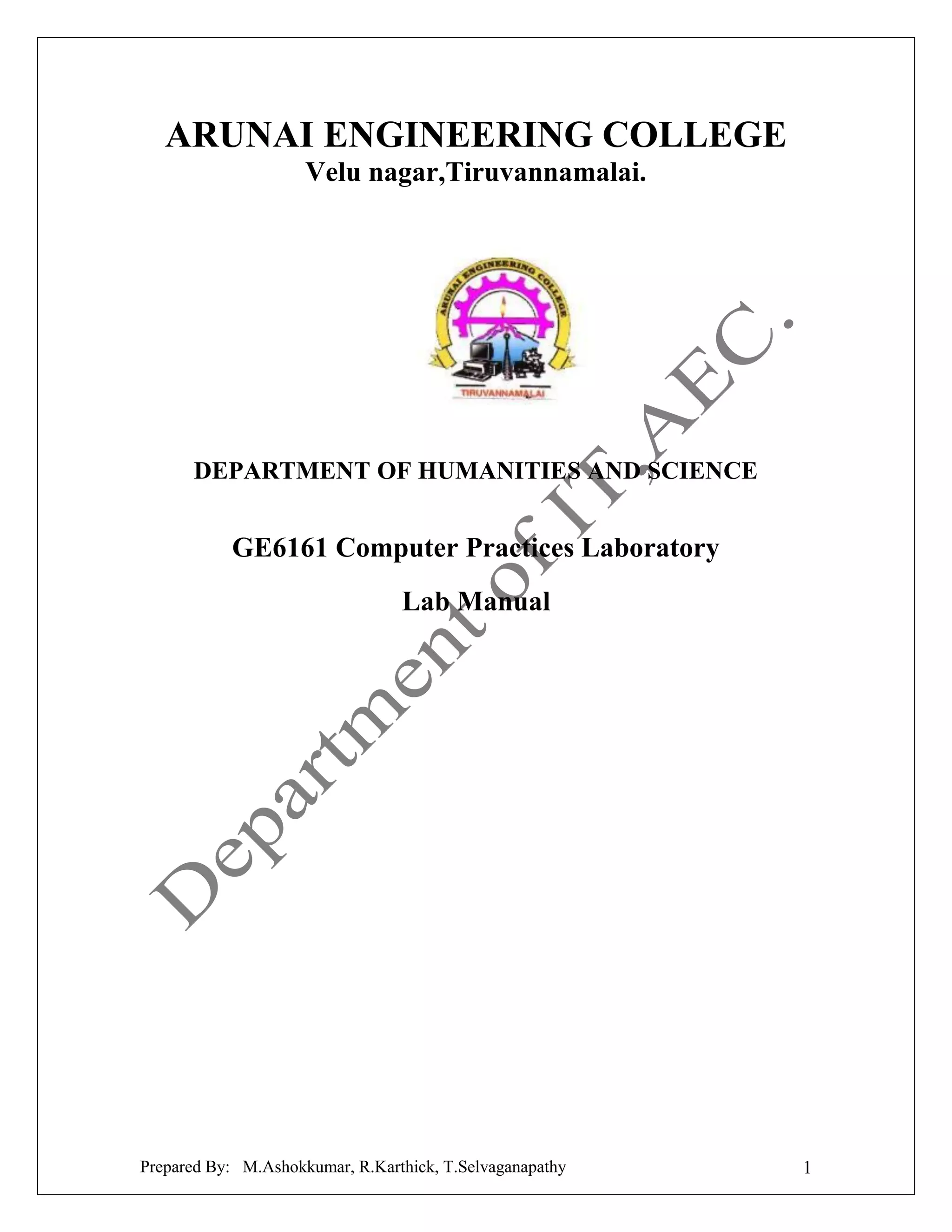 This document is a lab manual for the course GE6161 Computer Practices Laboratory at Arunai Engineering College in Tiruvannamalai, India. It was prepared by M. Ashokkumar, R. Karthick, and T. Selvaganapathy. The document lists 10 experiments covering topics like using MS Office/Open Office, creating charts and graphs, problem solving with flowcharts and programming, arrays, strings, functions, recursion, structures, and unions. Each experiment includes an aim, algorithm, program code where applicable, output, and a self-exercise section for students.