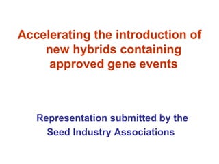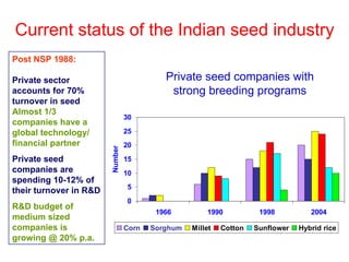 The document discusses the current status of the Indian seed industry and the introduction of new hybrids containing approved gene events. It notes that the private sector now accounts for 70% of seed industry turnover in India. It argues that the current hybrid-based regulatory system for approving new hybrids containing approved events is too slow, inconsistent, and restrictive. It has resulted in far too few Bt cotton hybrids being approved to meet India's diverse agricultural needs. The document advocates changing to an event-based approval system similar to other countries, which would allow faster introduction of new hybrids based on gene equivalence to approved events.