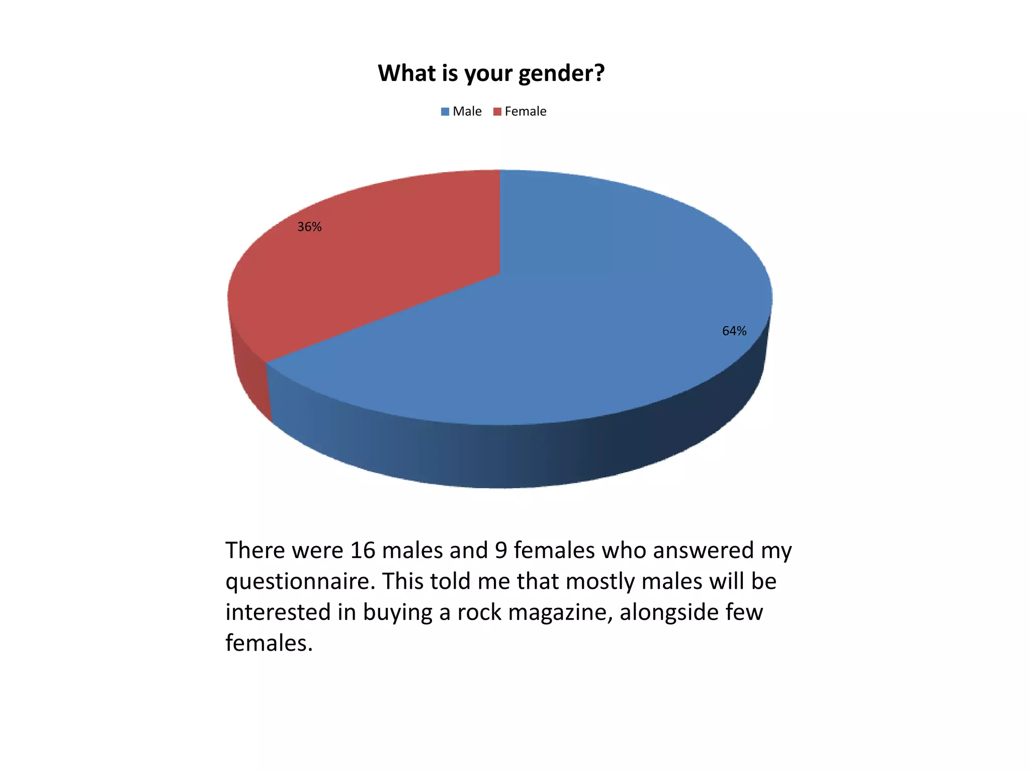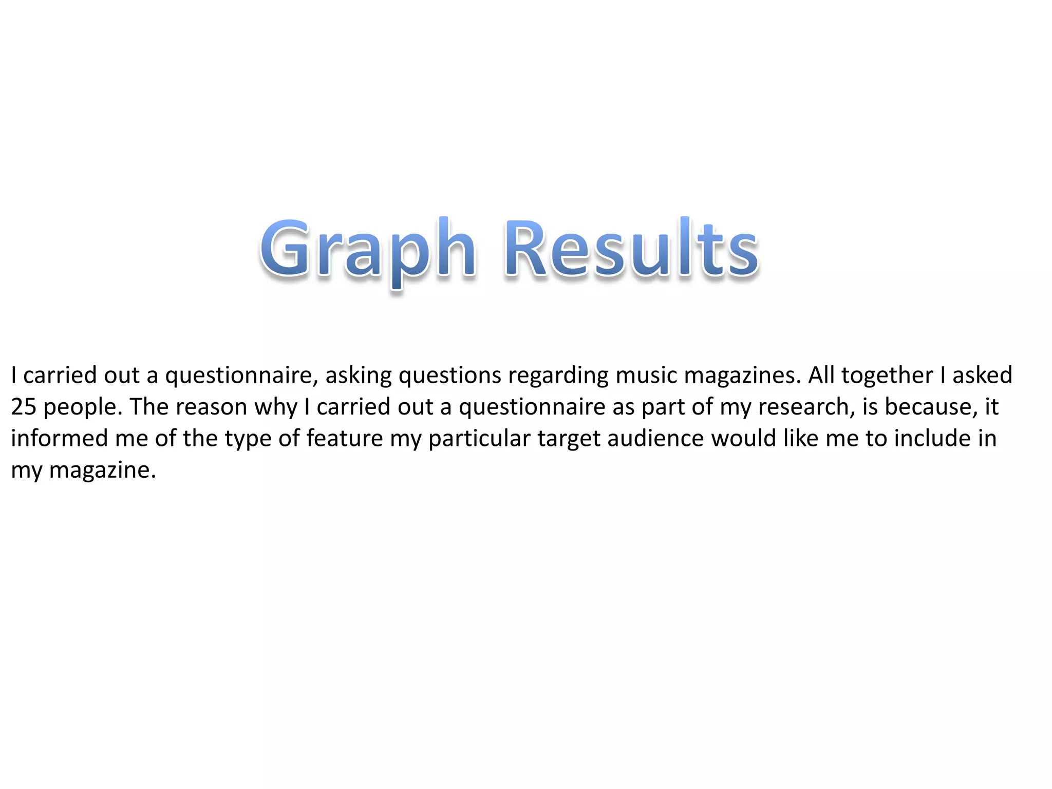 The document summarizes the results of a questionnaire about music magazines that was completed by 25 people. It found that most interested people were males aged 22-30 who were White British and enjoyed rock artists like Bon Jovi and Ozzy Osbourne. Most said they would buy a rock magazine monthly and expected it to include features like logos, pull quotes, mastheads and images.