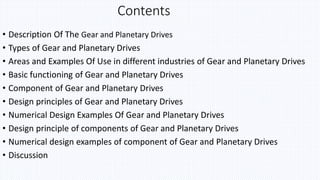 Gear drives are commonly used to transfer rotational motion and power between two shafts. They work by using a drive gear connected directly or indirectly to a driven gear. There are several types of gear drives that can be used depending on the orientation of the shafts, including spur gears, helical gears, bevel gears, worm gears, and planetary gears. Gear drives are composed of basic components like gears, shafts, bearings, and housing and are used in various applications like automotive transmissions, marine propulsion systems, industrial machinery, and more.