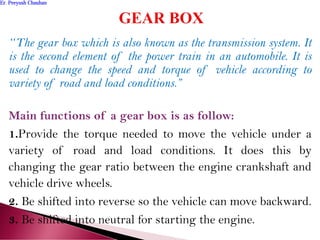 The document discusses various types of transmission systems in automobiles, focusing primarily on gearboxes, their components, and their functions in adjusting speed and torque under different conditions. It compares manual and automatic transmissions, detailing advantages and disadvantages of each, along with explanations of specific types like sliding mesh, constant mesh, synchromesh gearboxes, and various automatic transmission systems such as CVT and DCT. The content also emphasizes the importance of skill and control in manual transmissions versus the convenience of automatic systems.