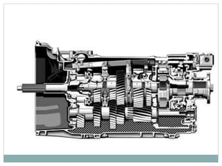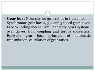 The document discusses various components of an automobile transmission system, including gear boxes, types of gears, and the necessity of variable gear ratios. It describes common types of manual and automatic transmissions, such as sliding mesh gear boxes, constant mesh gear boxes, and epicyclic gearing. The document also explains how fluid couplings and torque converters work to transfer power from an engine to drive wheels through hydraulic fluid and rotating impeller and turbine components. Overall, the transmission system allows the engine to operate at optimal speeds while enabling variable speed control of the vehicle.