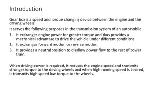 The document discusses gear boxes, highlighting their role in changing speed and torque in automobiles. It categorizes types of gear boxes, including selective, progressive, and epicyclic types, while detailing their advantages and disadvantages. Additionally, it covers automatic transmission systems, emphasizing their benefits such as smoother operation, reduced driver fatigue, and improved fuel efficiency.