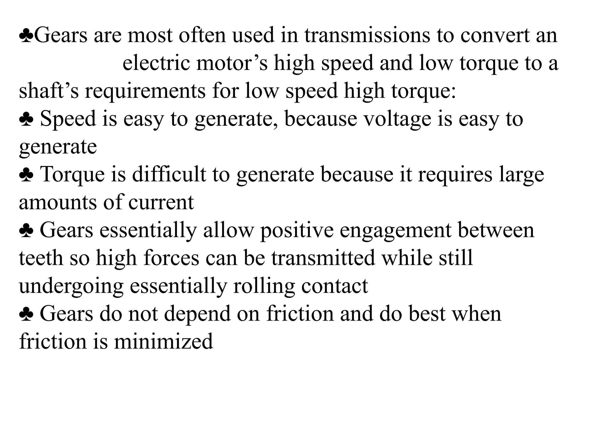 The document discusses the fundamentals of gears, their types, and their applications in transmissions to convert speed and torque. It covers the kinematics of gear trains, tooth specifications, contact ratios, and interference problems associated with gears. Additionally, it provides formulas for gear analysis and detailed descriptions of spur, helical, bevel, and worm gears.